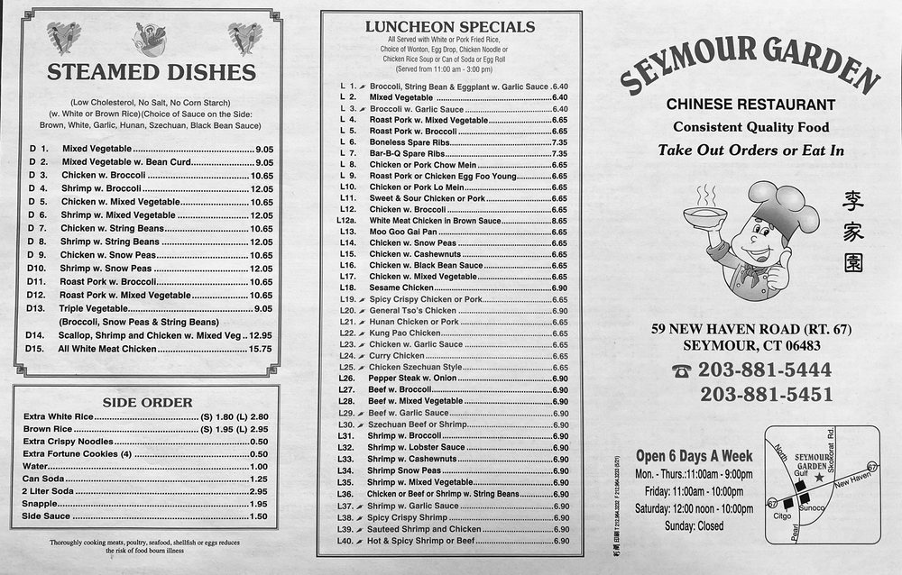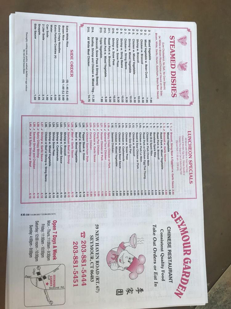 Seymour Garden in Seymour, CT is a Chinese restaurant known for its fresh and delicious food. Customers rave about the quality and consistency of the dishes, with favorites like Chicken with Broccoli and Moo Goo Gai Pan. The menu also offers a variety of options for vegetarians, such as Vegetable Fried Rice and Vegetable Lo Mein. The restaurant prides itself on efficient service and friendly staff, making it a go-to spot for many locals. Fans appreciate the flavorful and generous portions, with dishes like beef and veggies, lo mein, and General Tso's chicken standing out. If you're looking for authentic Chinese cuisine in Seymour, Seymour Garden is the place to try.